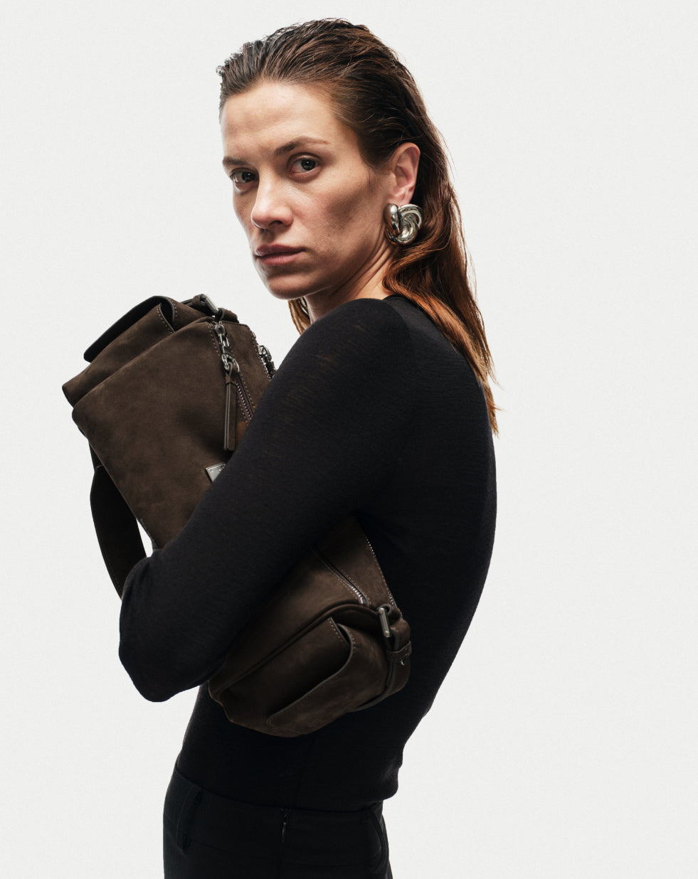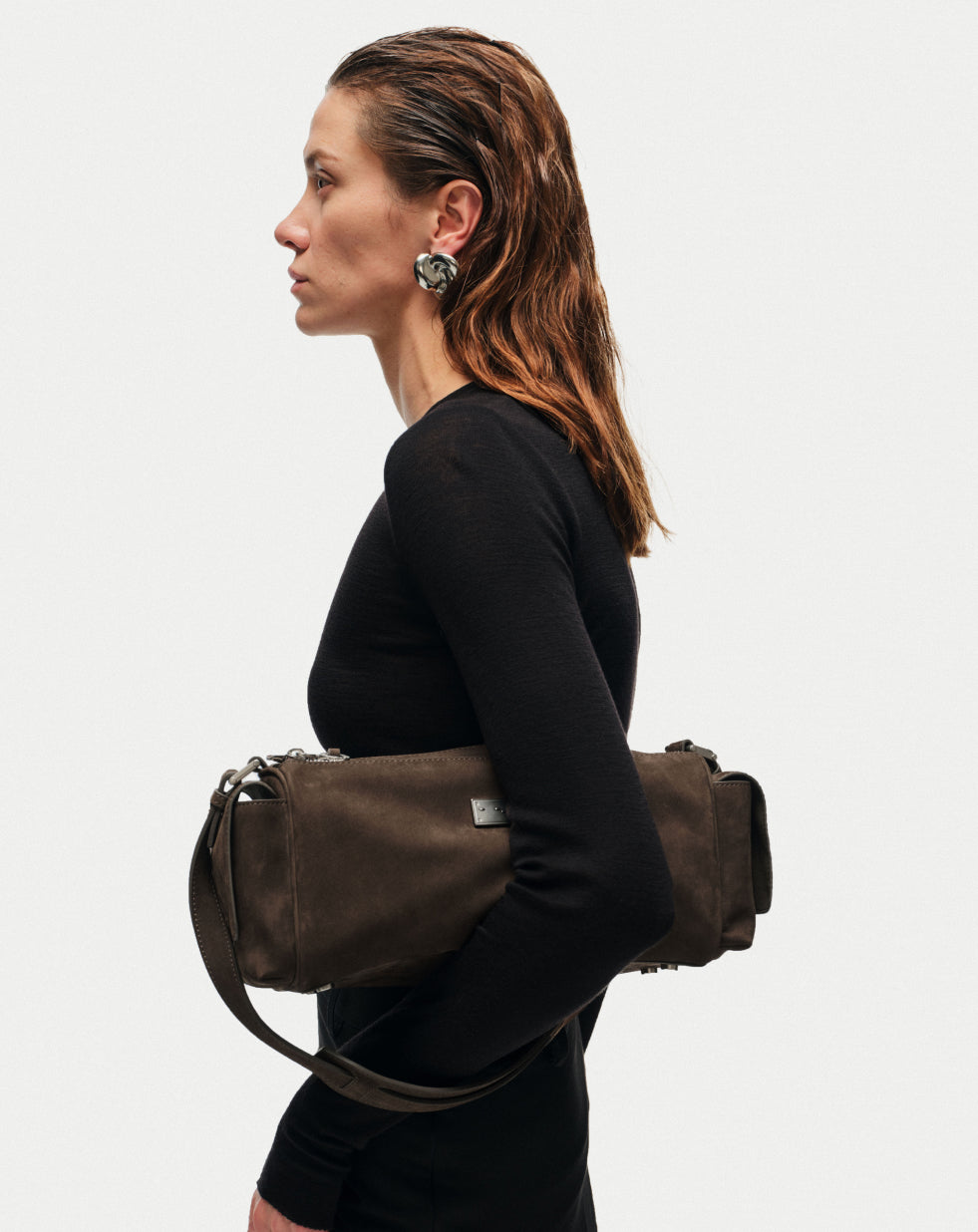 Our signature Capture Medium Sling Bag now comes in nubuck leather, finished with matte sliver hardware.