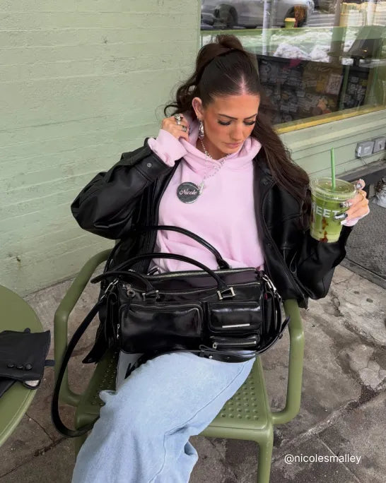 Comes with a complimentary matte silver daisy-shaped bag charm